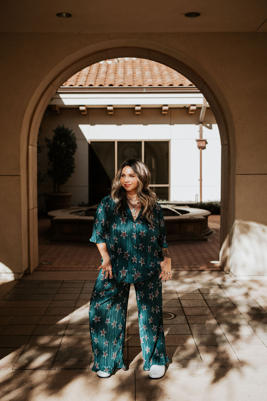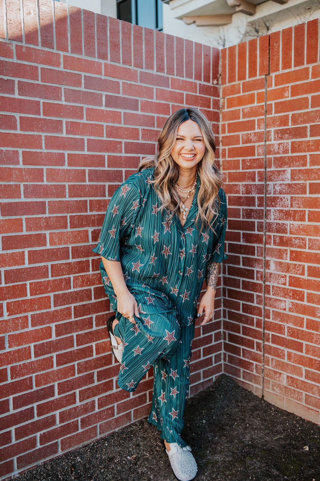 Pattern designed by Mariah —  This plisse set  features a breezy plissé fabric with a flowy fit that moves with you. Designed for laid-back luxe, this two-piece set includes a relaxed button-up top and matching high-waisted pants made to turn heads whether you’re poolside, jet-setting, or brunching with the girls. It’s giving “I didn’t try… but still ate.”